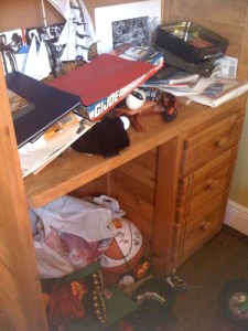 - My son organized his desk (see before photo in my last post) on his own with no pushing! This is a quantum leap! (See After photo below).